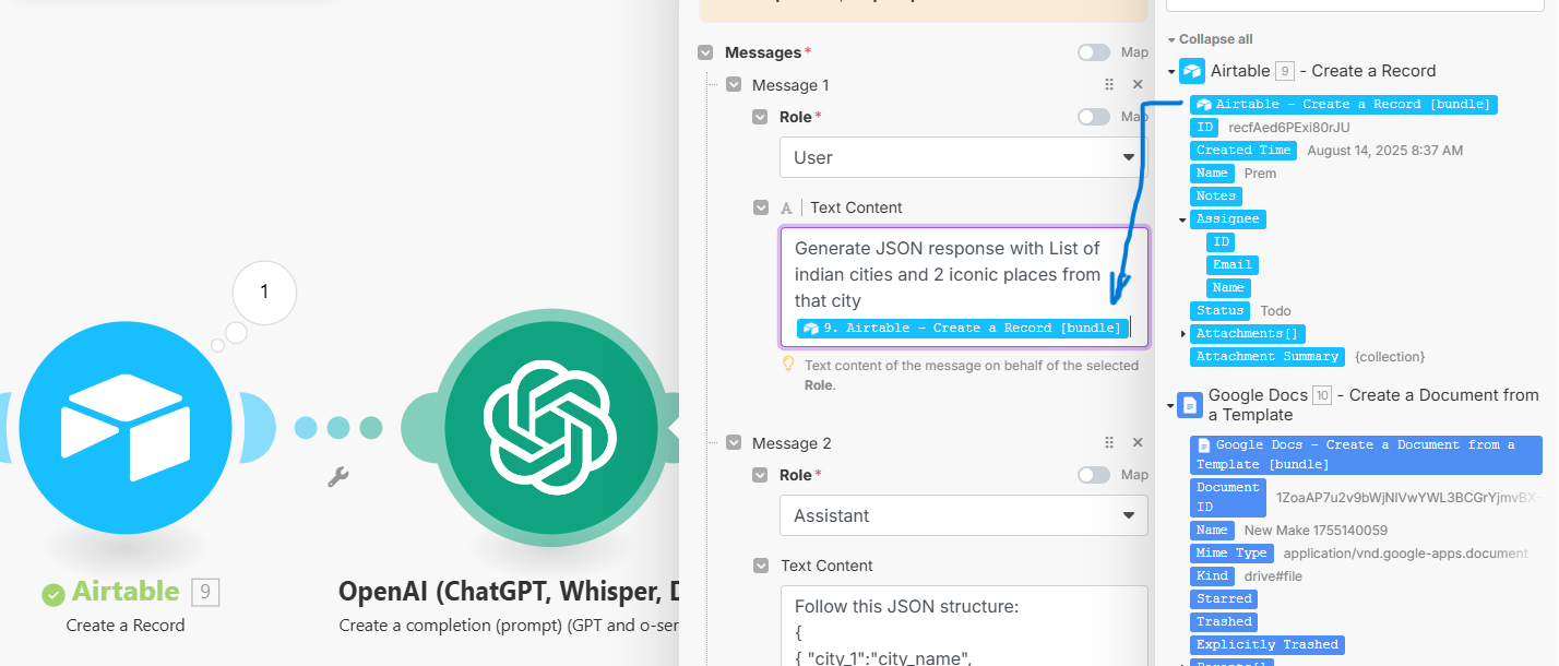 Everything after the GPT step works fine, but I’m struggling to pass all the relevant data from the Create a record step into GPT.