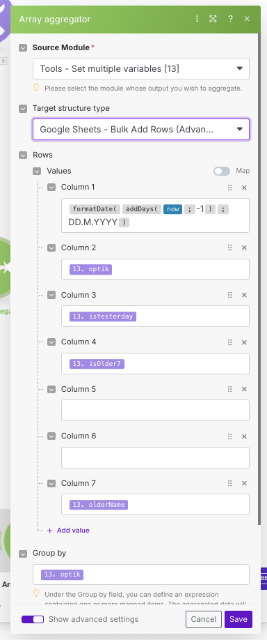 I have created example data structure as is in Monday to test it and save operations, but I can not figure it out how to exactly map data so they belong to right Optik and pasted in Google Sheets in bulk, so I can save operation.