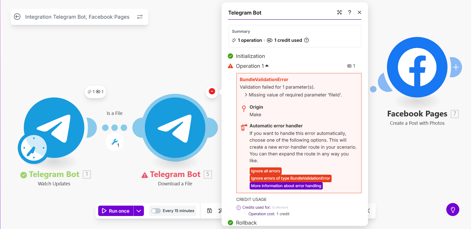 I have created my scenarios as shown below to do auto post from telegram channel to facebook pages.