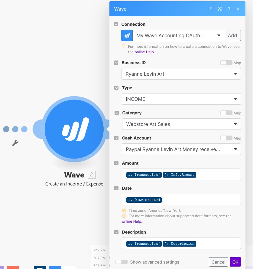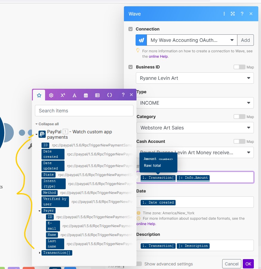 Hi all! I couldn’t seem to find any existing forum topics about Paypal & Wave for this type of connection in Make. I’m new at this and wanted to make sure what I’ve set up seems correct, so figured I reach out and see if anyone could give me some guidance/ let me know if I’ve made mistakes.