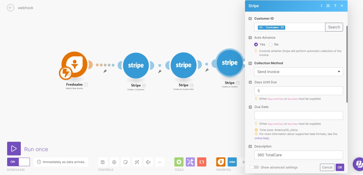I have a trigger (webhook), then I create a client (Stripe), but for some reason I can’t create and send an invoice