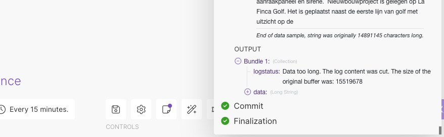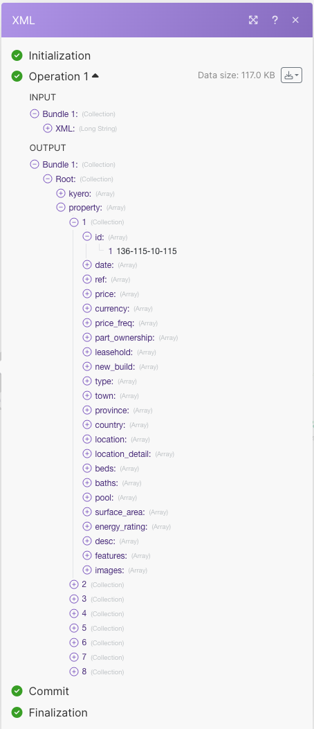 I’ve already setup a scenario with a test XML file (9 properties) and everything was working fine. However, when I tried to use it with a production XML file that has over 800 properties, I’ve run into the following error in the Parse XML module: