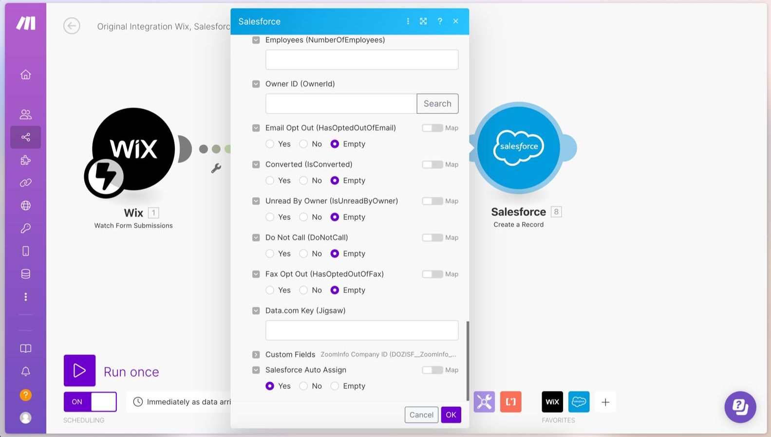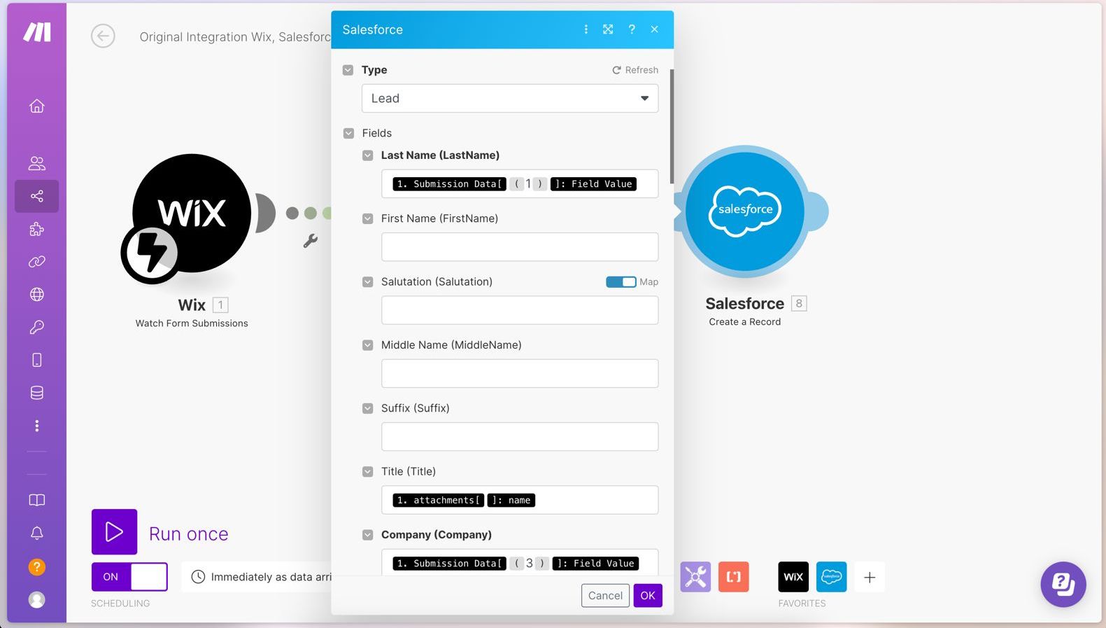 I have an automation running that captures the data from the Wix form and sends it to Salesforce, specifically in Leads.