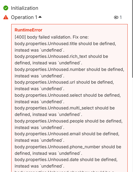If I’m not mistaken, this is the type of error message that usually occurs when I’ve set up a filter with a data type mismatch (that is, I’ve left “Text:Equals” when I’m comparing dates, or the like), but this is a Notion module (create a data source item) rather than a filter, and I’m using “map,” not manually entering the data (that is, the first and third properties here, as opposed to the second):