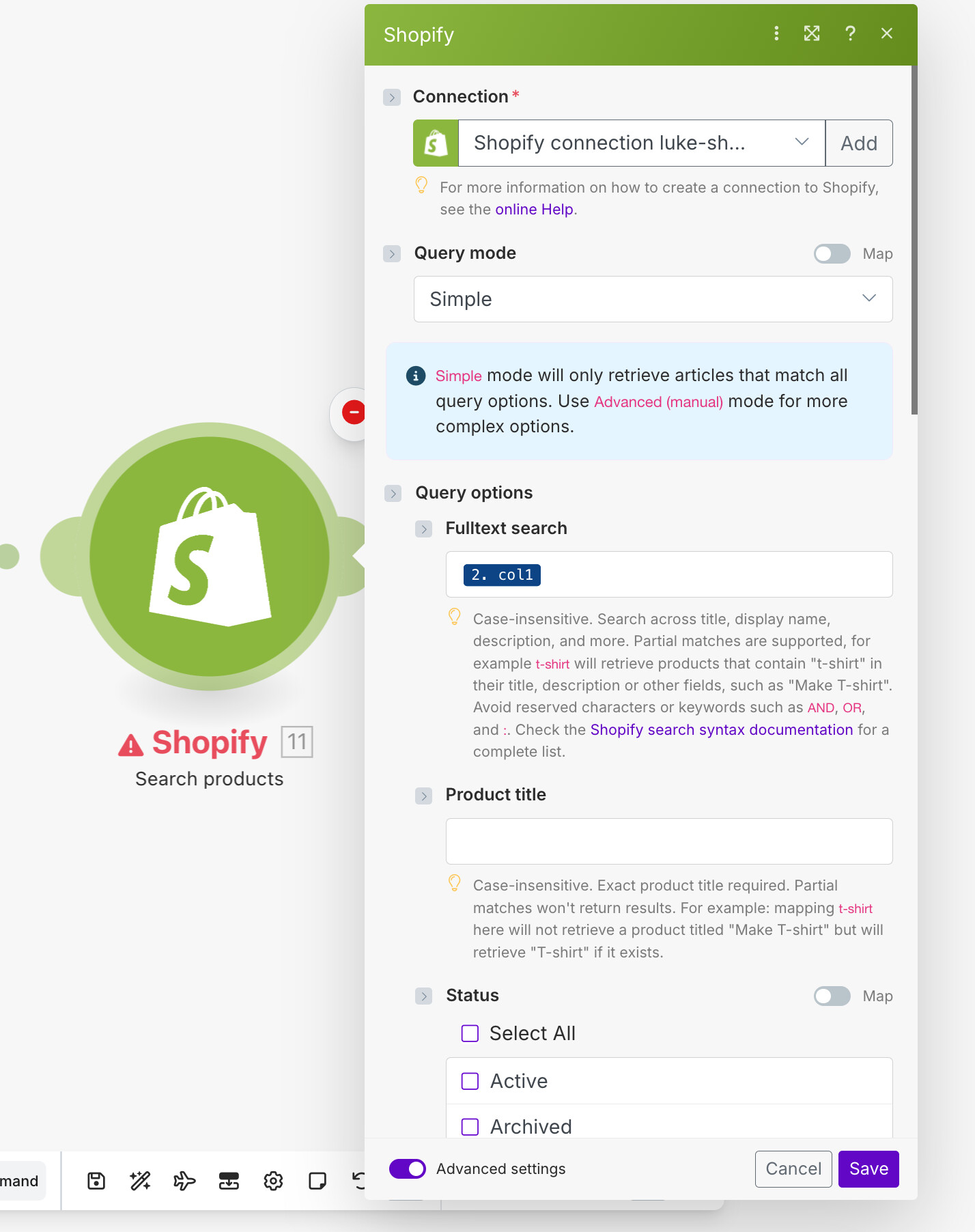 Oh sorry, I forgot that for the search module Make handles the syntax, so it should be something like: