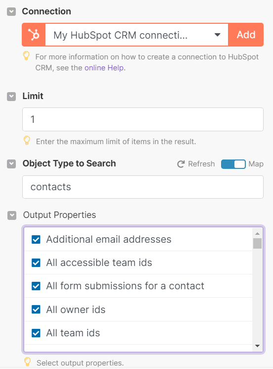 Hi, simply click in the email body content box the map (drag and drop) the output values from HubSpot into the text.