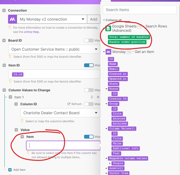 Below is the connected board column that will need the data entered into and column to reference in the google sheet or data store.
