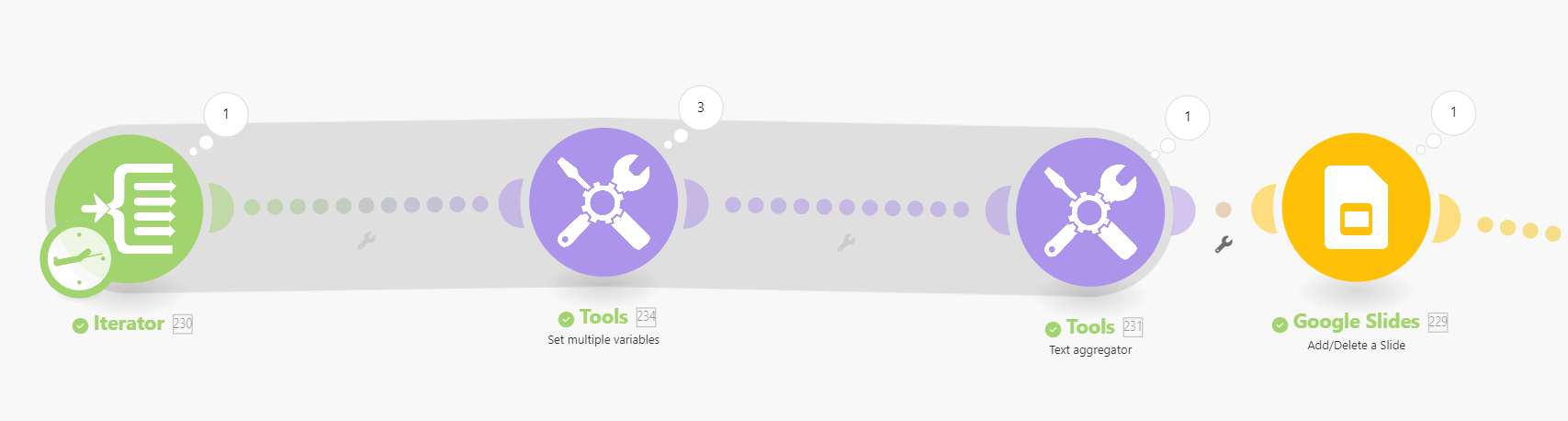 I know you can use two Make modules (“Create a Presentation From a Template” or “Create a Slide from a Template Slide”) to dynamically create Google Slides content…
