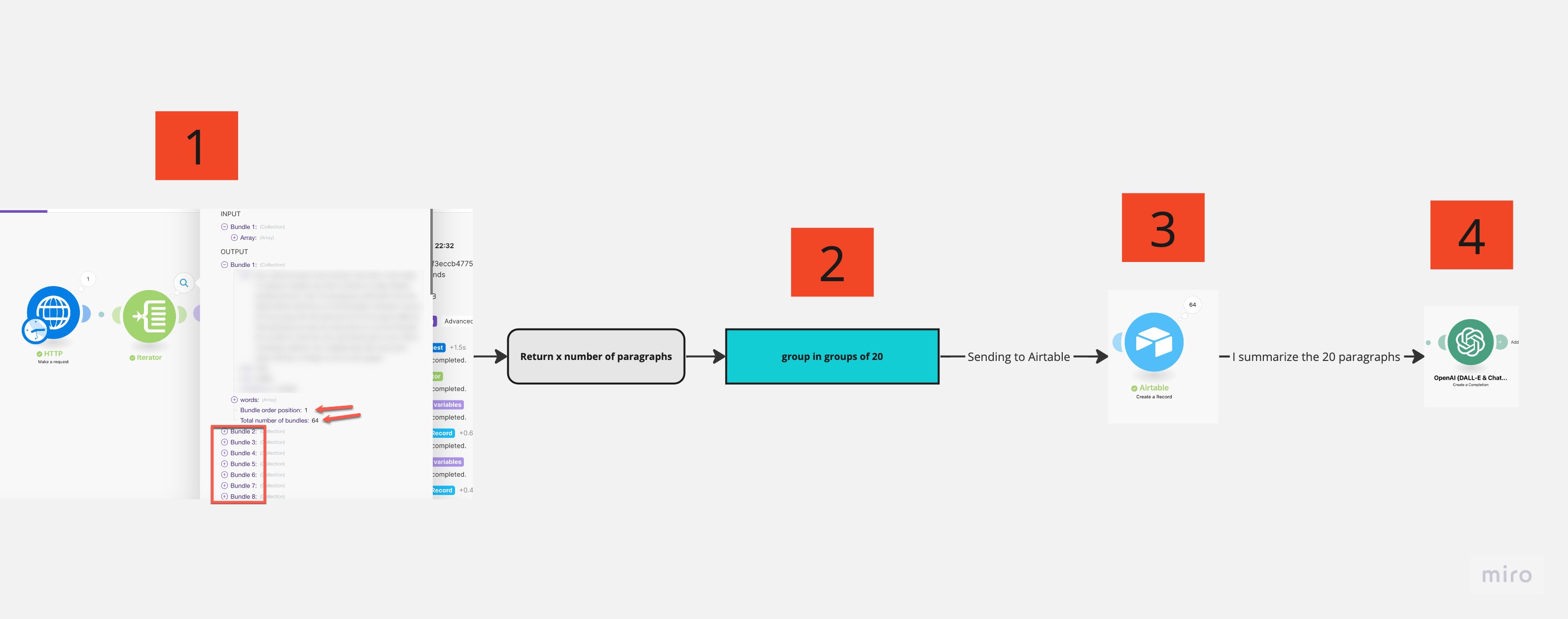 To group the paragraphs into batches of 20 and send the last batch with the remaining paragraphs, you can use a repeater and the slice function in Make. Here’s an overview of the process: