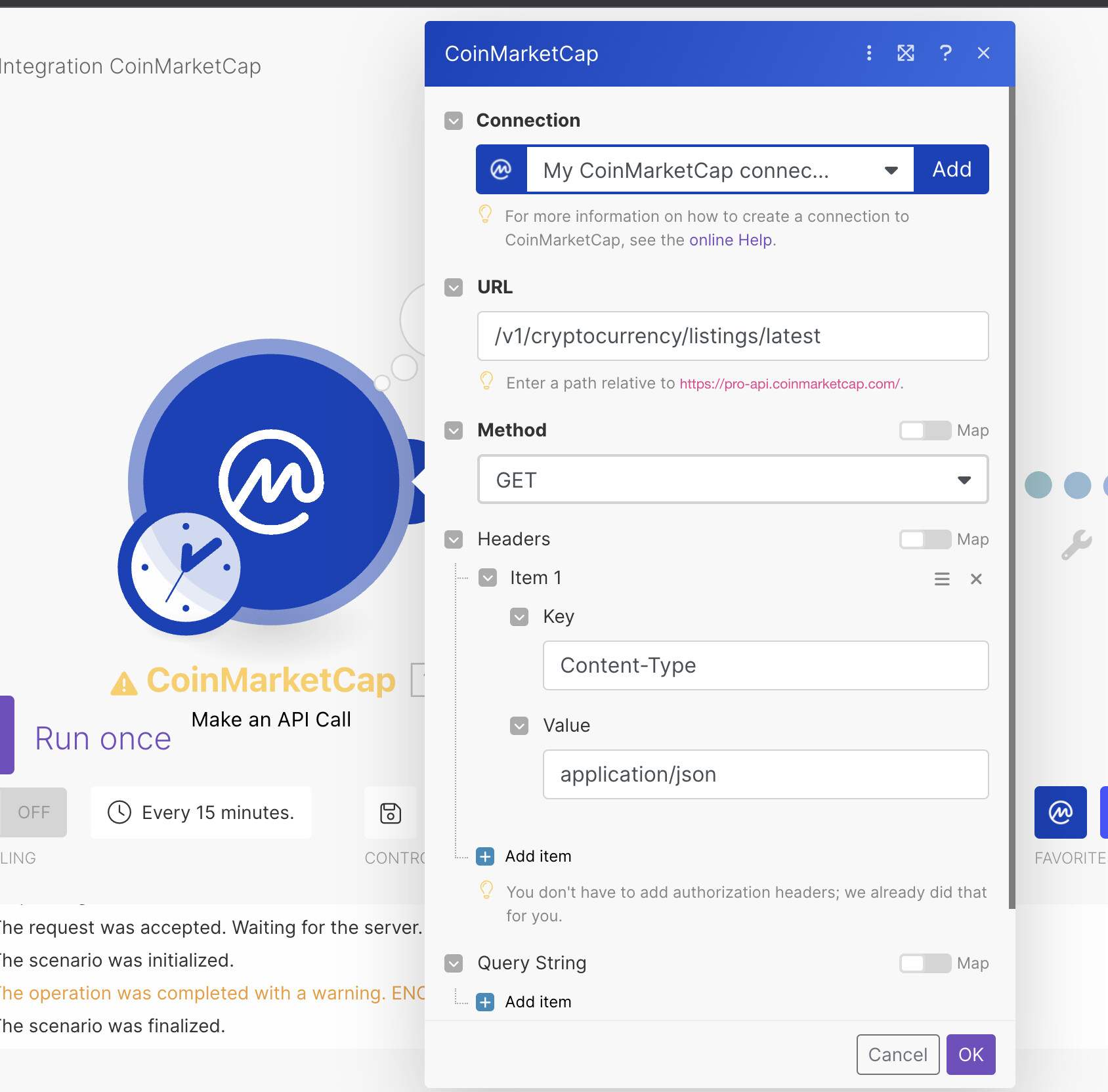 I’d like to use make to connect CoinMarketCap + GoogleSheet + Webflow CMS.