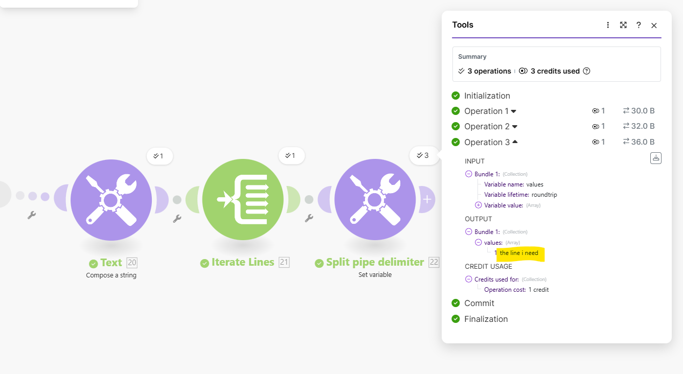 The ‘Alternative solution’ posted by samilew Read multiple lines of a CSV file and parse each line individually into columns - #4 by samliew is indeed working perfectly for me — it successfully splits the lines of my text into separate operations.