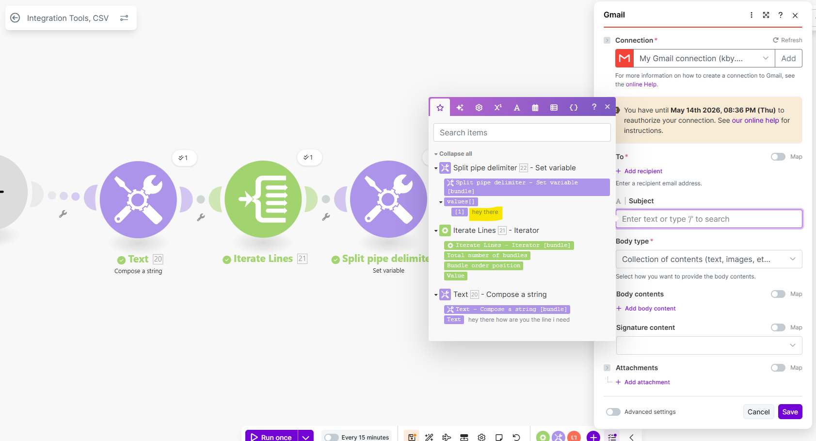 However, I’m running into trouble with the Gmail module: I’m not sure how to attach specifically the 3rd operation to my email. I’m very new to Make and have little experience, so I would really appreciate any guidance or step-by-step help.