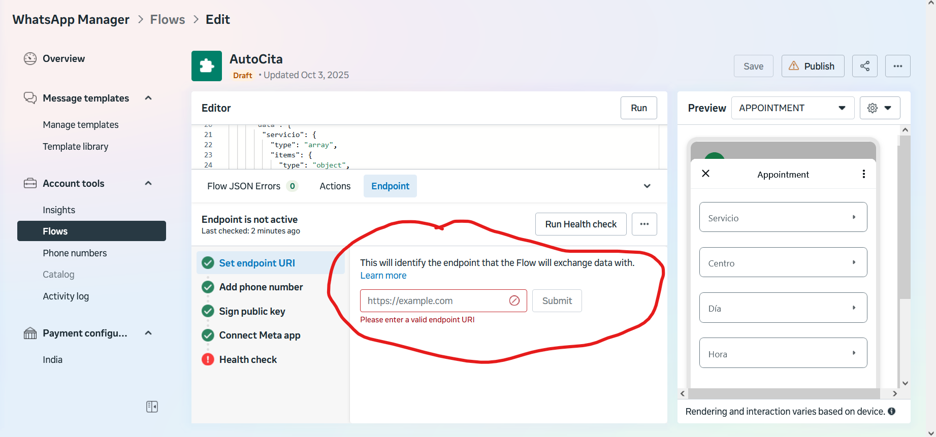 As I’m configuring a Flow in WhatsApp Business, I need the webhook URI to establish the endpoint. It is a requirement of this process.