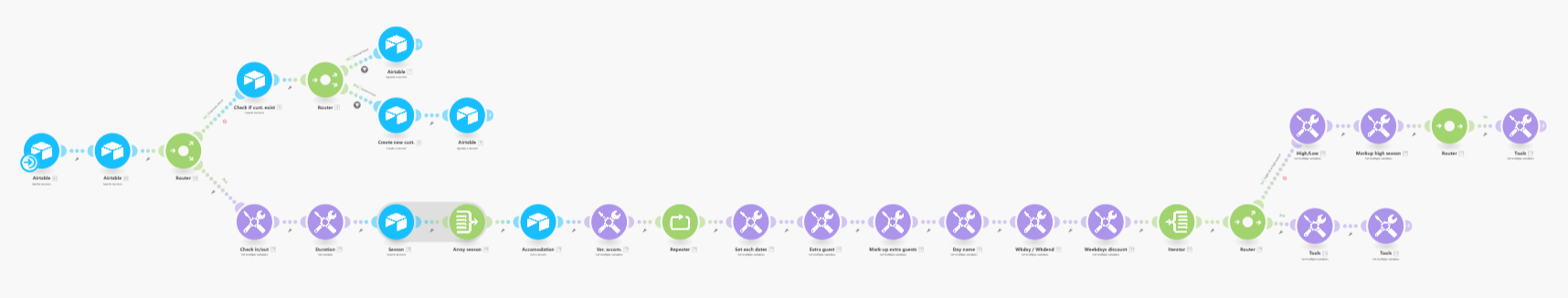 - Then, as you advised, I have used a module “set variables” with a “if” formula (see screenshot below) to check if each dates are within one of the 8 periods. My problem is that this returns 28 bundels (4 dates x 8 seasons).
