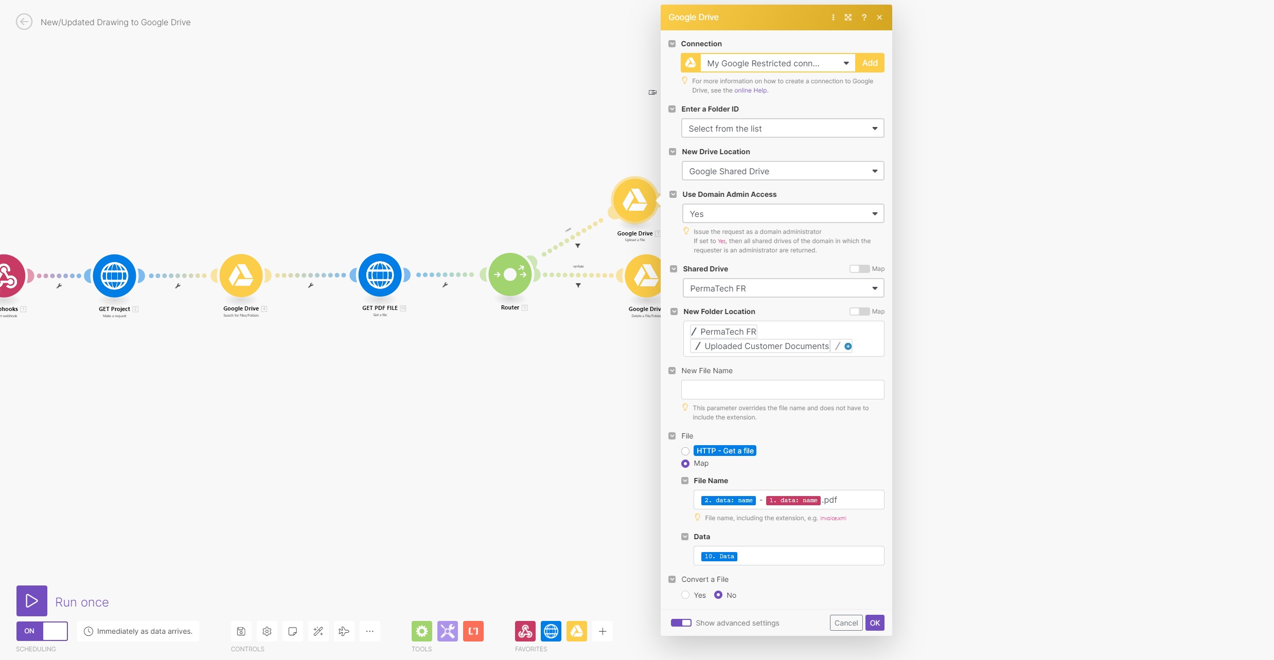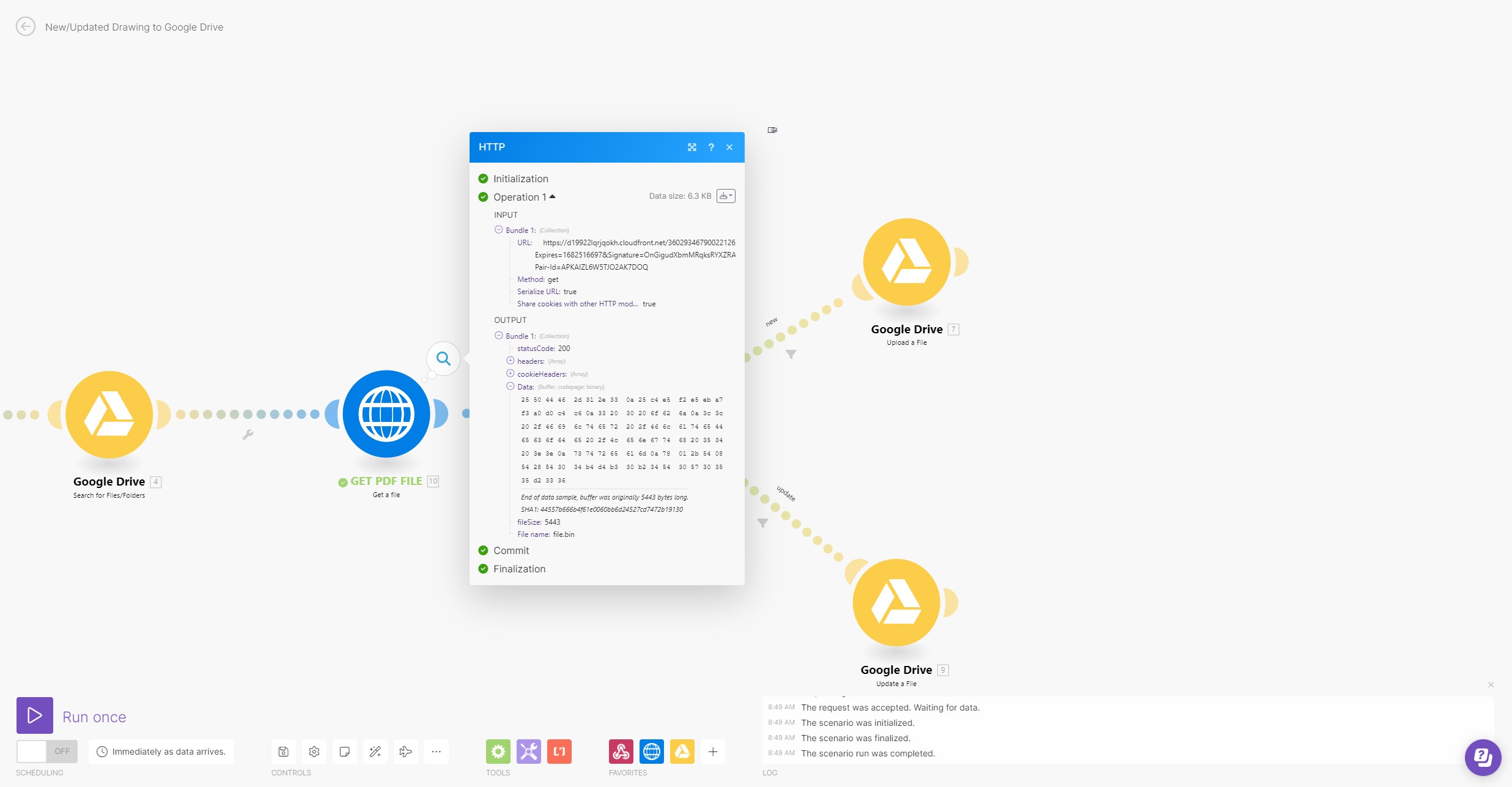 So I’m trying to upload a file from a url to google drive, the google drive module file step is mapped to a HTTP get a file module. I have the url pointed to it, but it’s outputting a .bin file. How can I get this as a pdf file to upload into google drive? Thank you all for your help.