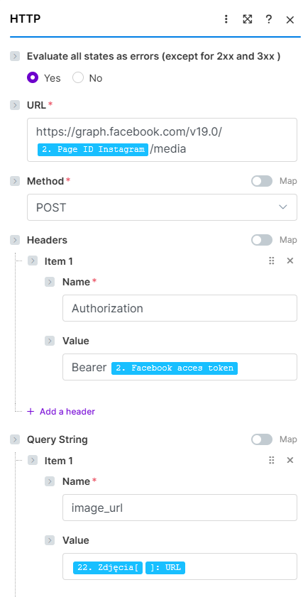 Module Switch: The unstable one-step Create a photo post module was replaced with two raw HTTP: Make a request modules (Container Creation and Publish) to enforce the modern API protocol.
