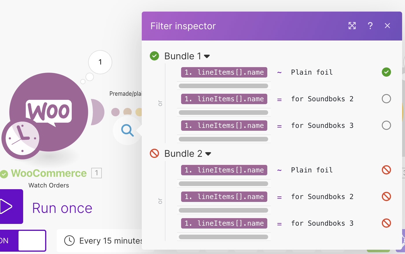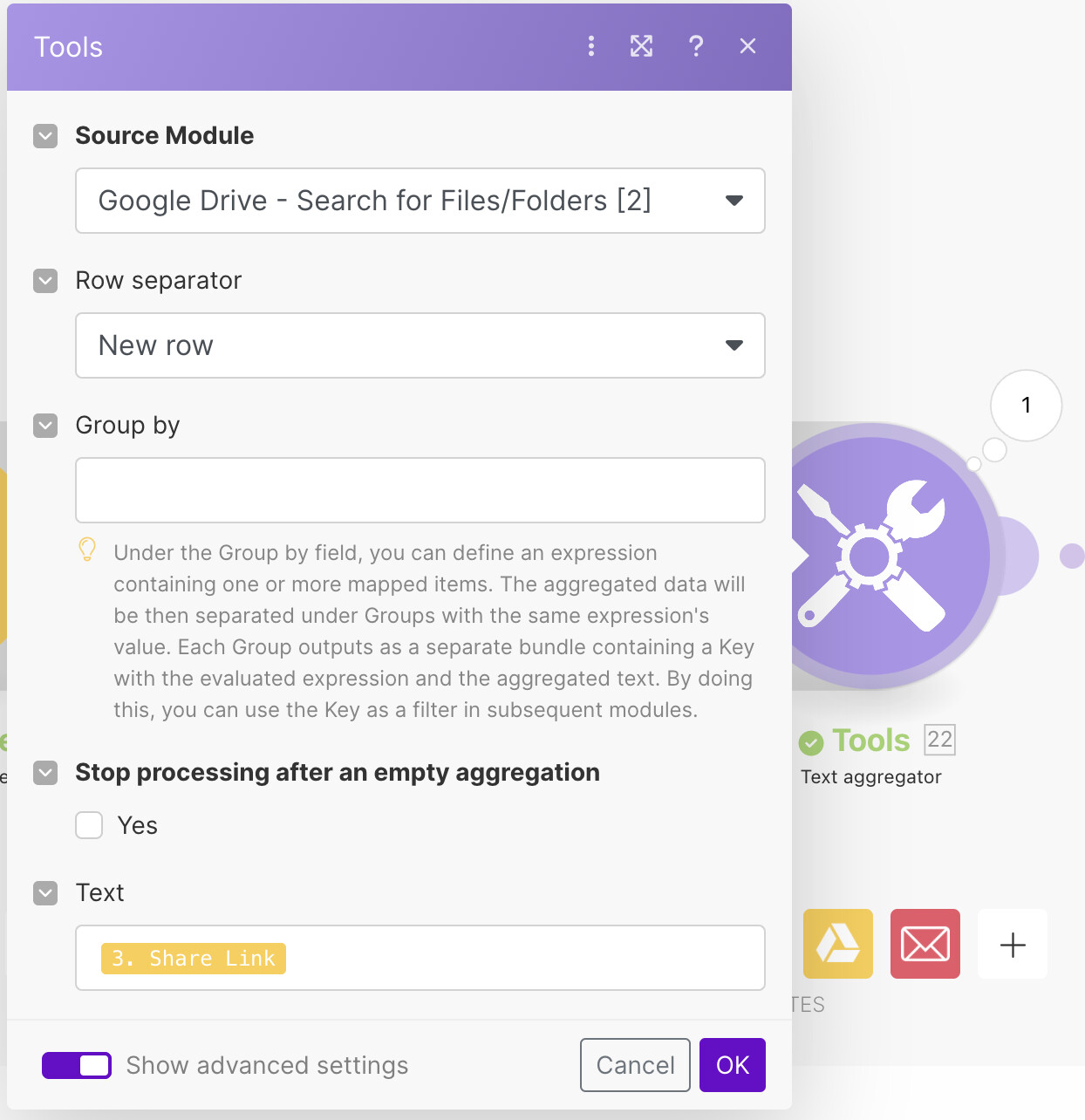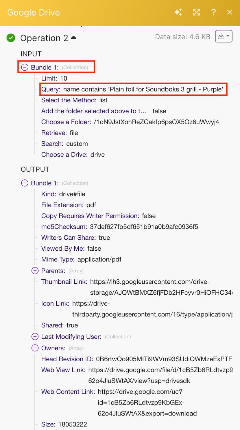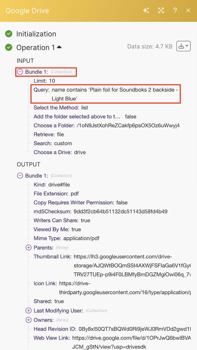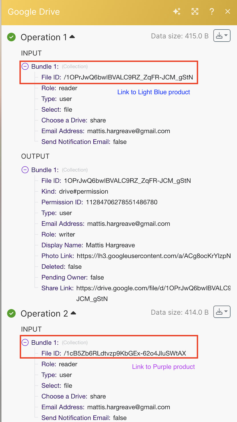 But just before it sends the email I use the text aggregator to combine the shared links using file id. This somehow ends up messing everything up as the final e-mail only sends the shared link for the first product “blue” and not the second. Also worth noticing that {{1.lineItems.quantity}} is 1, not 2 for some reason…