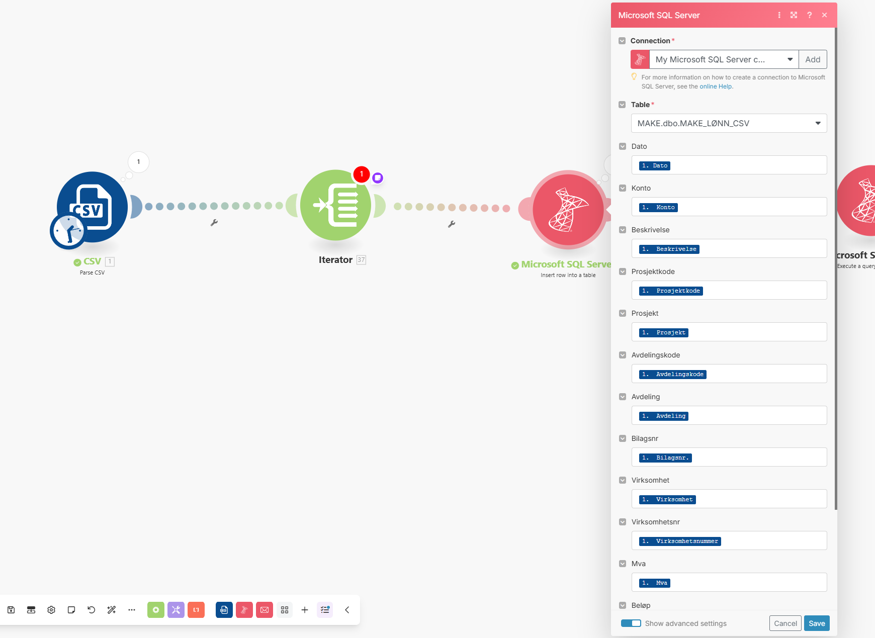 I need a module that iterates throught the parsed csv so that I can insert it into the SQL table. I need to do this since I can only insert values from the first row of the CSV, the other ones are inaccessible: