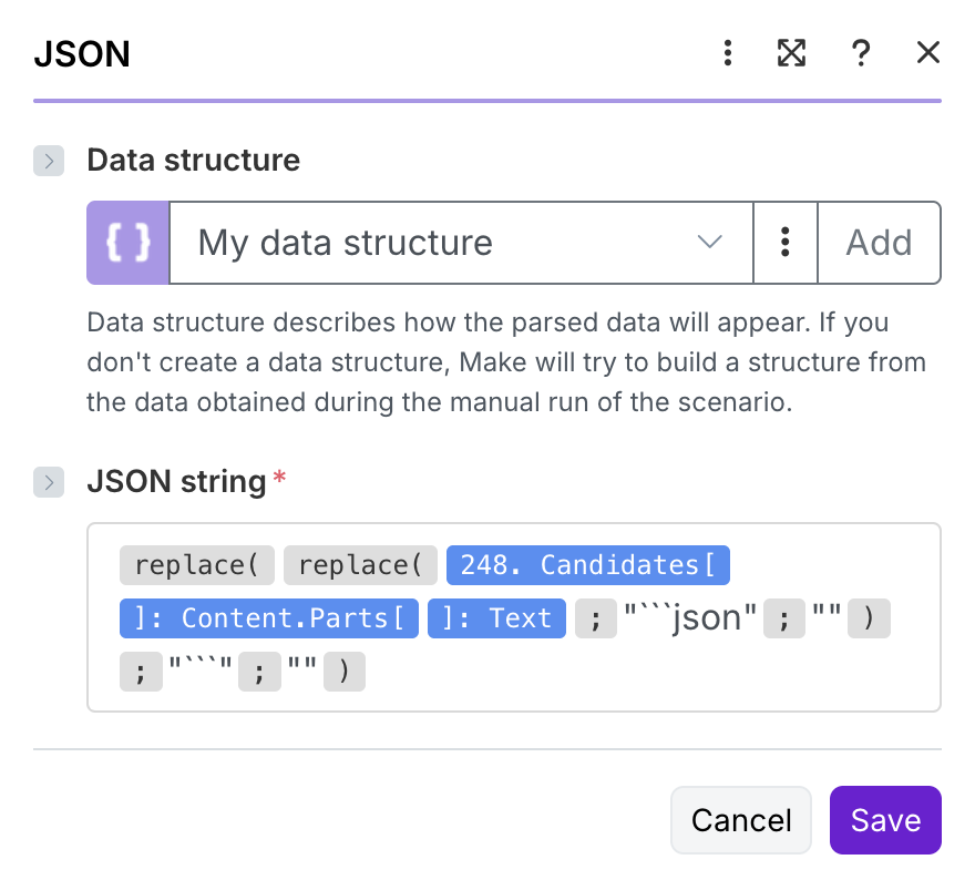 Gemini’s output in the operation log looks perfectly valid JSON, and I’ve double-checked that the Data Structure has two text fields: