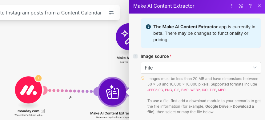 If Monday provides a URL to download the file, you’ll need to use HTTP Get a File to first download the file, then pass that in to the Make AI Content Extractor. If it’s not a publicly-accessible file then there may be another Monday module to help download files.