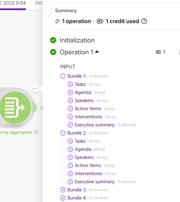 After the 2nd Iterator, you Aggregate all the results (Value) it generates, but the Source Module must be the 1st Iterator, which is the one that produced N operations (N = the number of bundles in the outer Array).