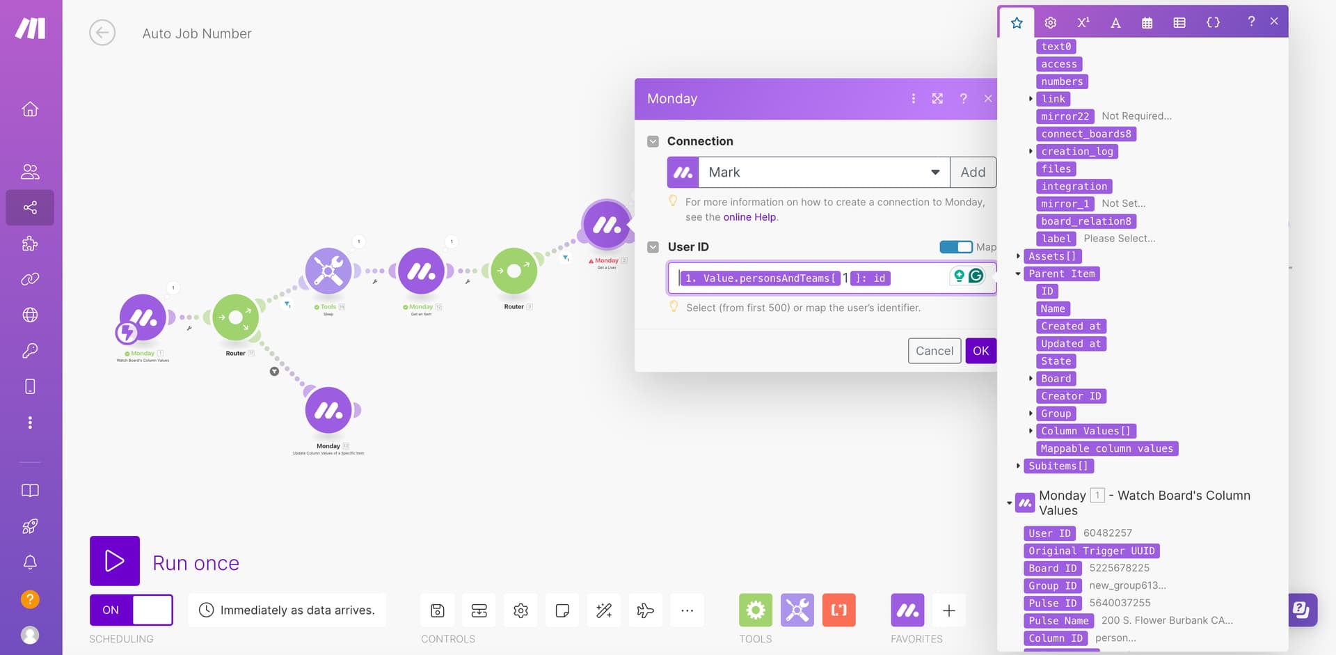 Do you have an example Monday.com User ID on hand? Can you try to right-click the Monday.com module and ‘Run this Module Only’ with the User ID? (f.e. 60482257)