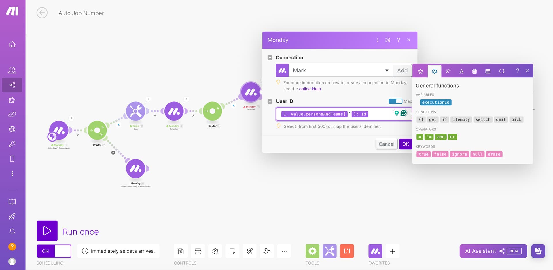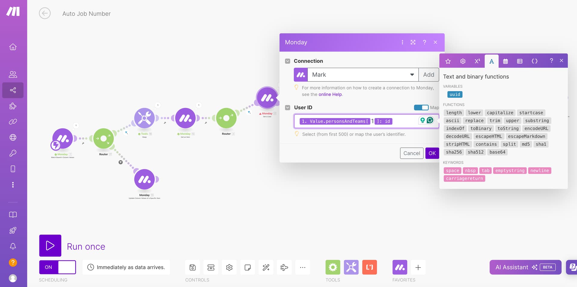 Our company uses Monday.com and we have make.com create job numbers based on the project manager selected in Monday. For example, if the project manager is Allyssa Corson, the job number would auto-create as “A100”, and if I create another job for Mark Philpott, it would create “M100”, and so on.