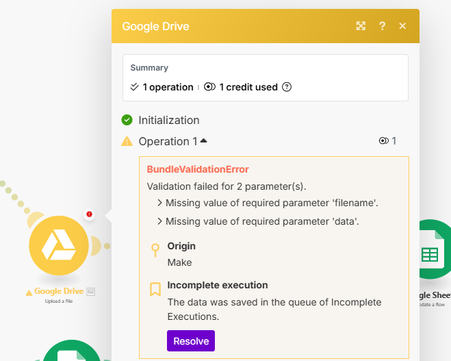This error means that there are no values for the filename and data fields in the Google Drive module. The values mapped to those fields are blank and nothing is getting passed from one of the previous steps.