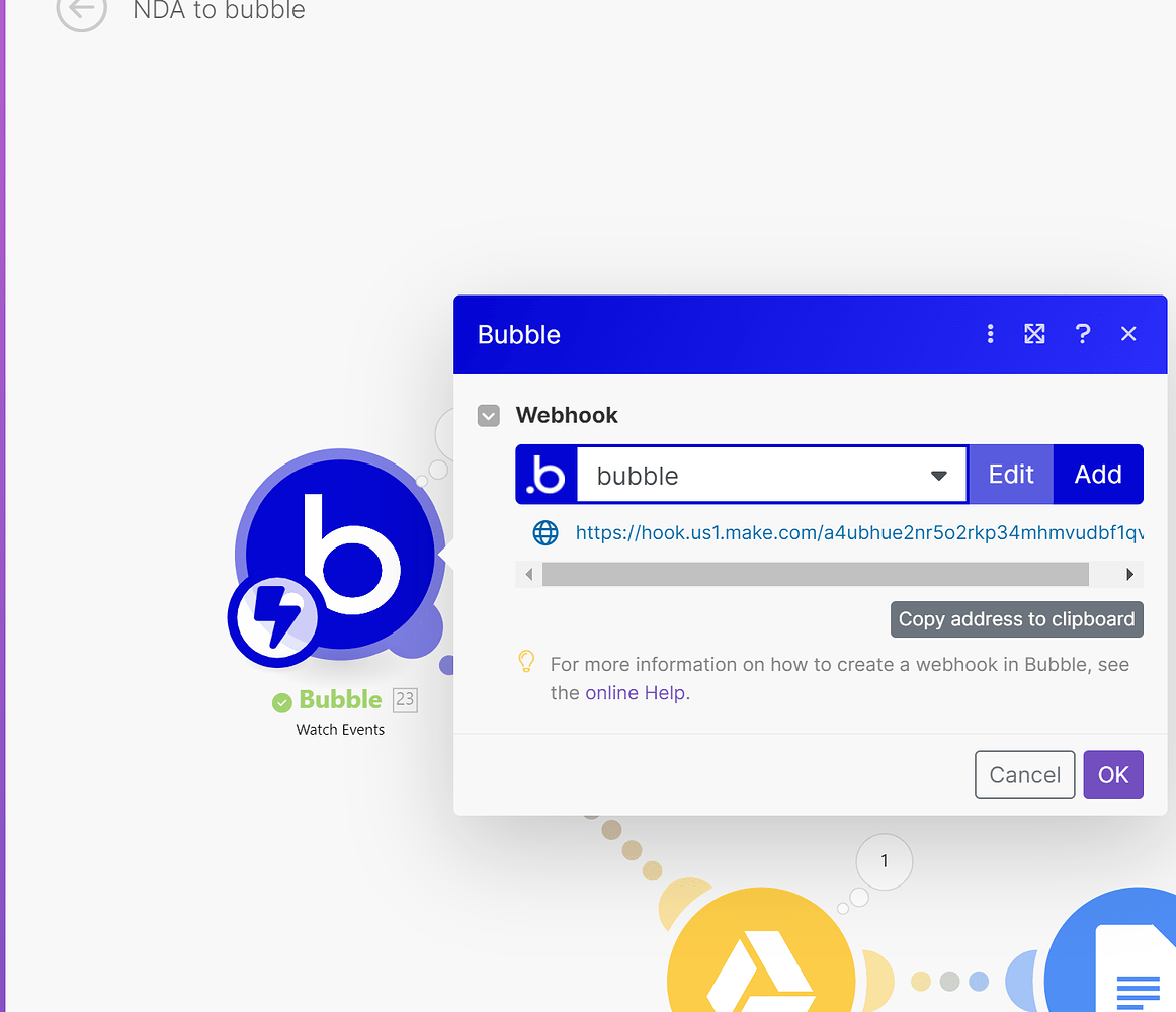 Hi. Try remove and add the webhook module again. If it not works, create a custom webhook try add the webhook direclty in the buble interface
