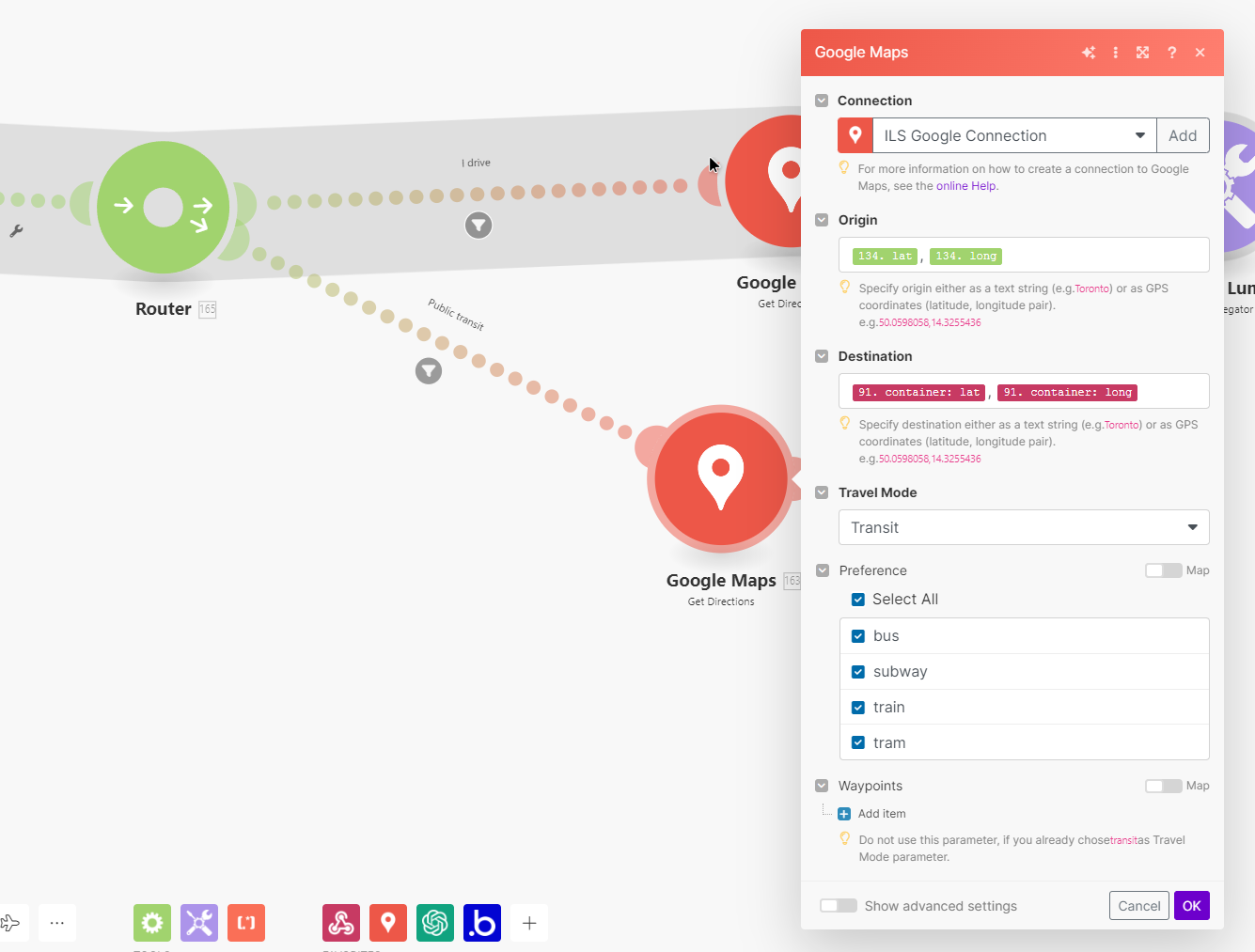 I need to get the distance from on point to another for each object from a JSON and store all of this in a long string to pass it to ChatGPT, but there is a caveat when I try to do it based on the form of transportation these users picked.