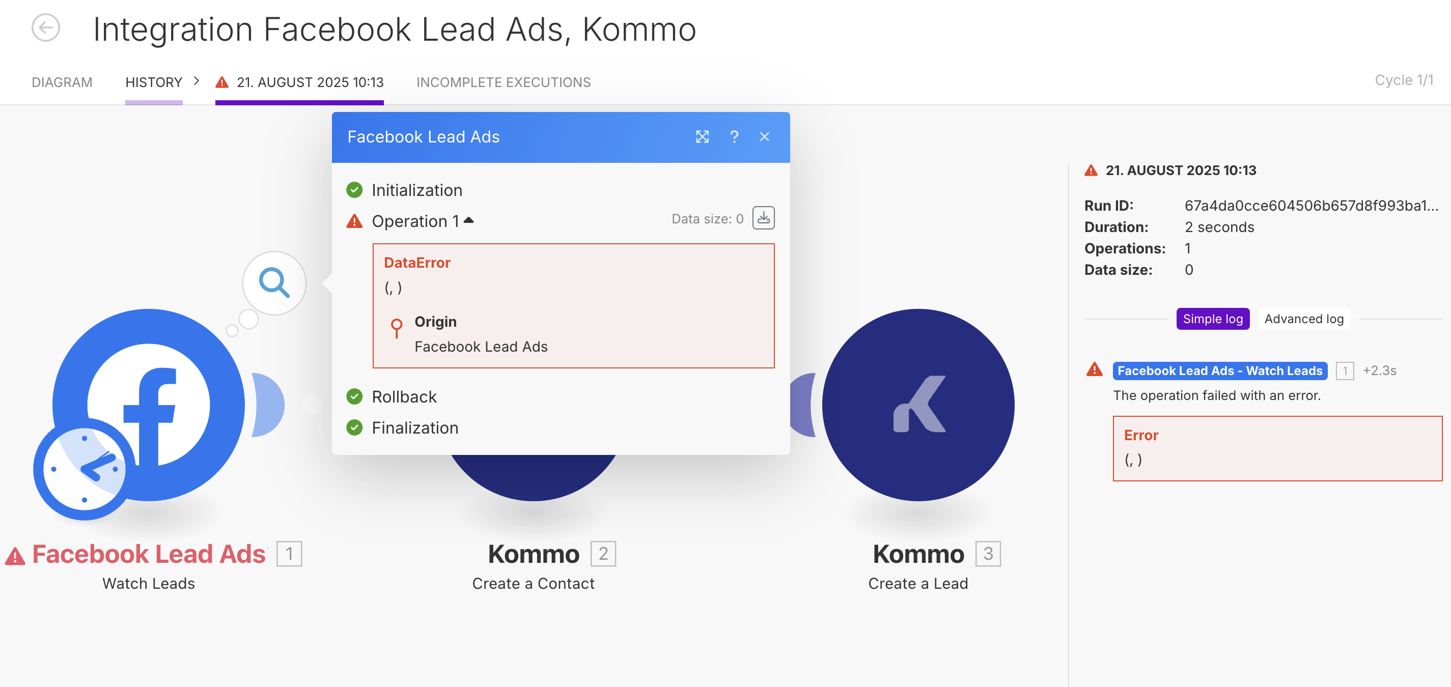 I’ve been using Make for two months and I have a scenario that transfers leads from Facebook Ads to my CRM. From time to time I noticed some errors in the logs, but the scenario kept running and the leads were transferred consistently.