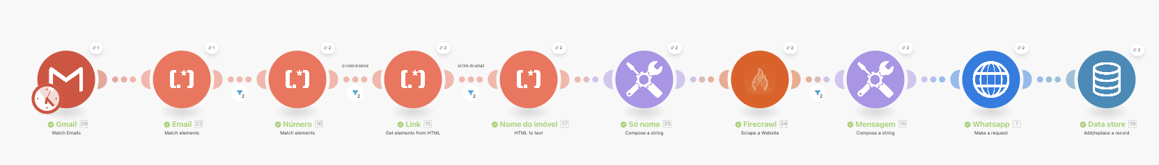 My scenario extracts data from one email (like name, message, property link, and phone number) and then sends a WhatsApp message (http) to the lead.