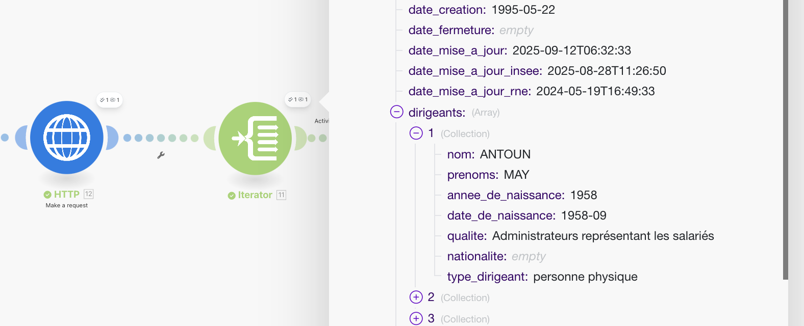 And in fact my worflow put in my datastore “dirigeants” field (Array) all the item from the source such as : nom, prenoms, annee_de_naissance, qualite, nationalite, type_dirigeant, denomination, etc…