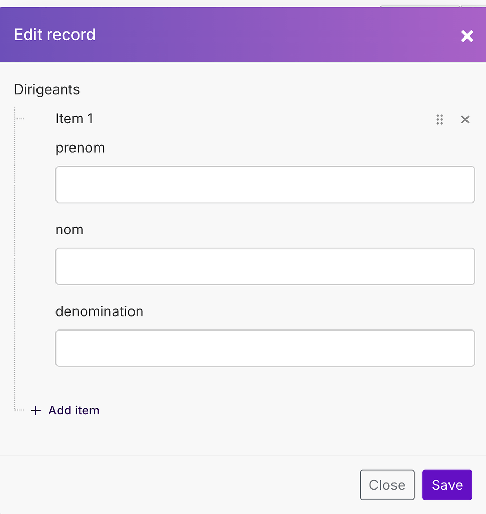 I’m expected the for exemple to have in my “dirigeants” field (Array) the follows item : prenom, nom, denomination