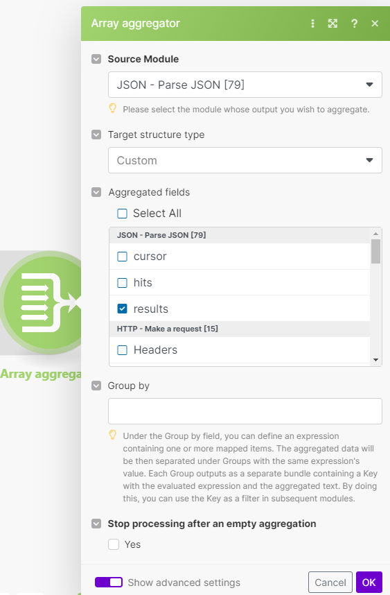 Here, I would like to count the number of fields that are present in each Bundle of my Json, to make a total sum. But it does not work the numeric aggregator returns me 0 in output and even 0 in input!