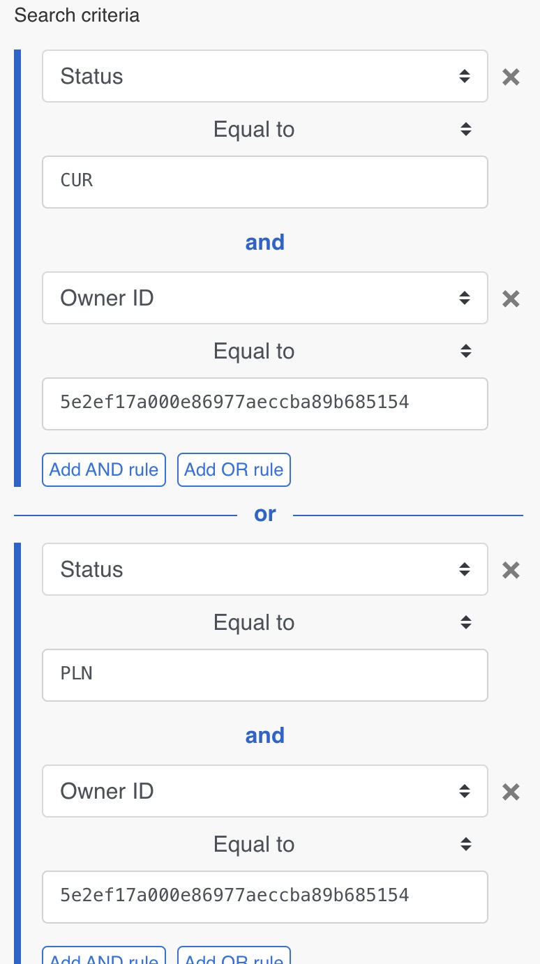 I’d like to have one search where (Status = CUR OR PLN) AND (OwnerID = 5e2ef17a000e86977aeccba89b685154)