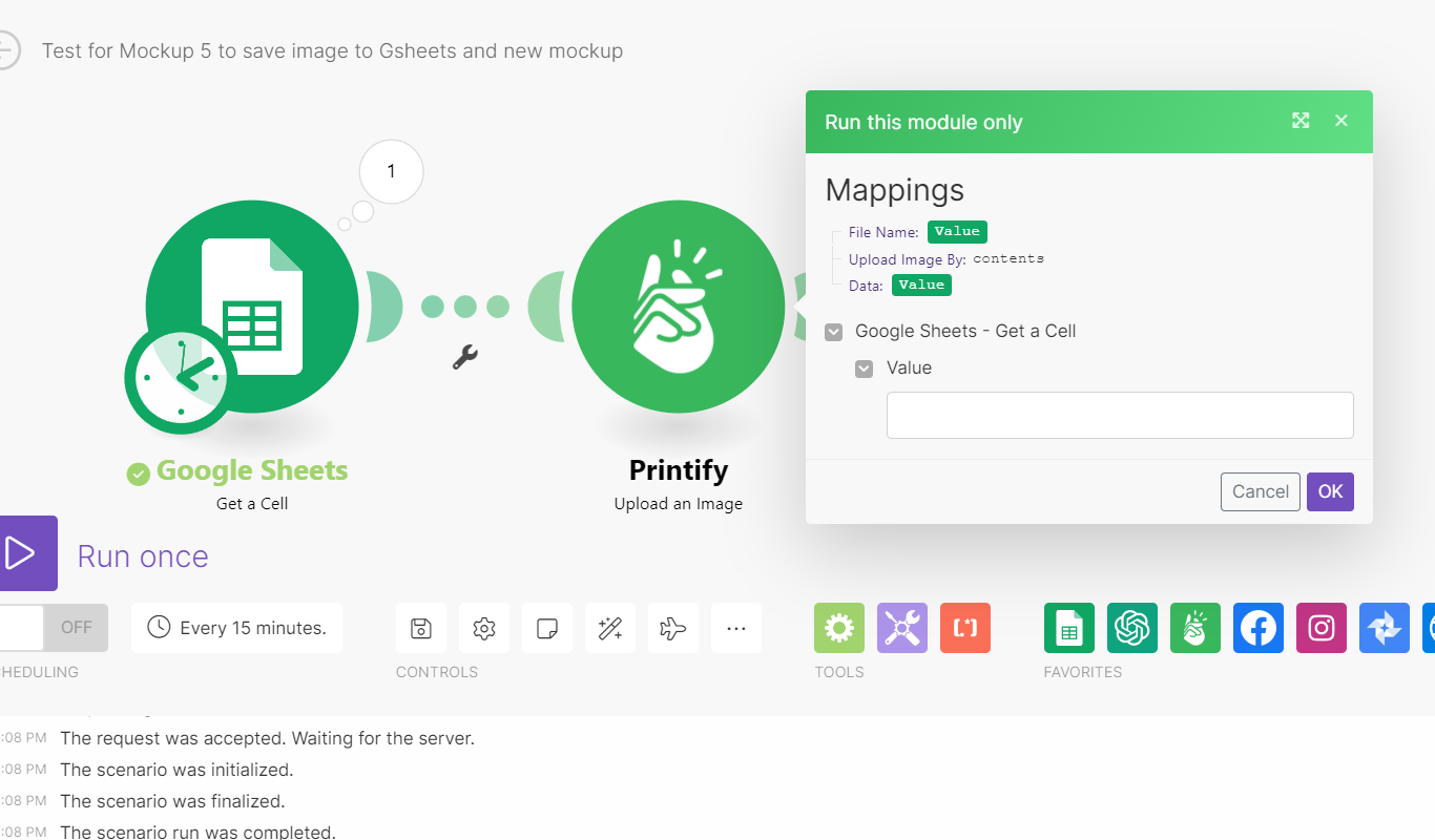 Step 3: Populating the Printify module with the value returned from Google Sheets shows the URL is loaded as output.