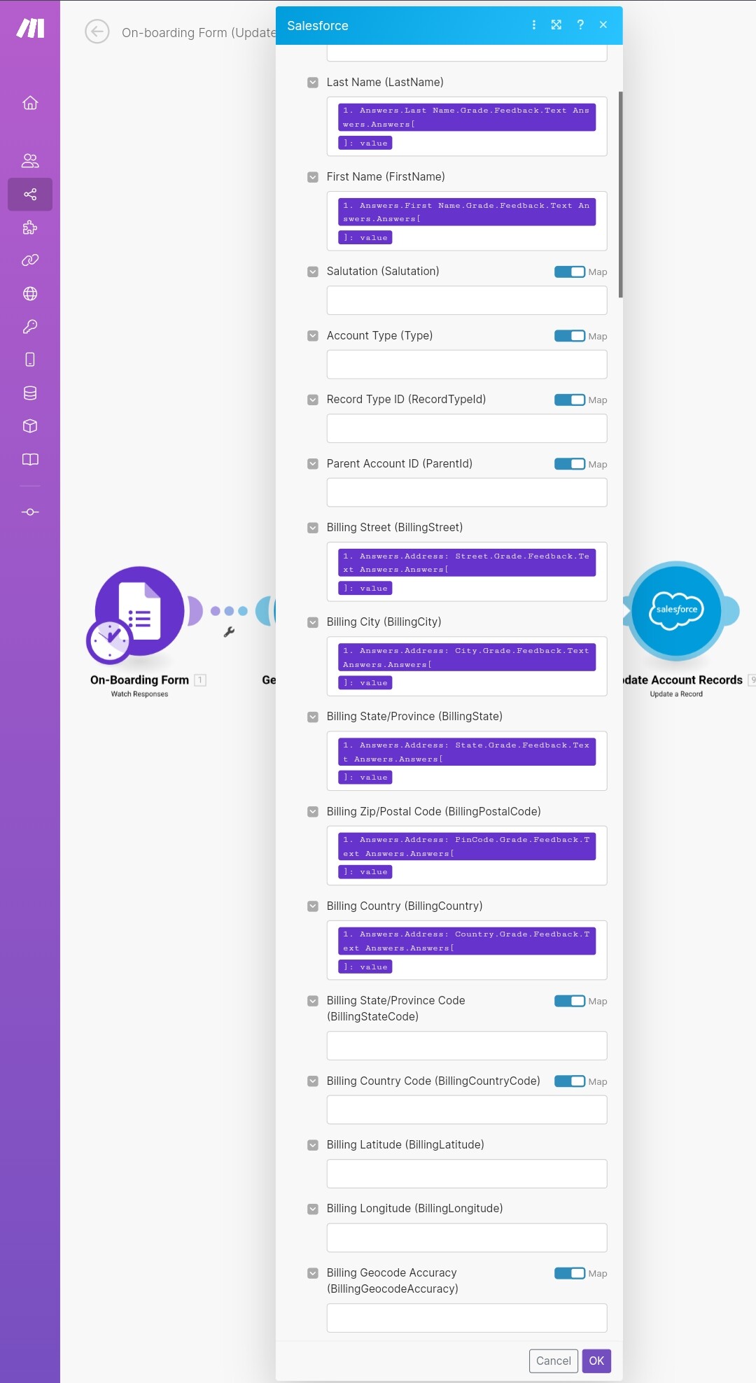If you look at the mapping of (for example) the Last Name field in the Salesforce module, you’ll see that it ends with … Answers[ ].value