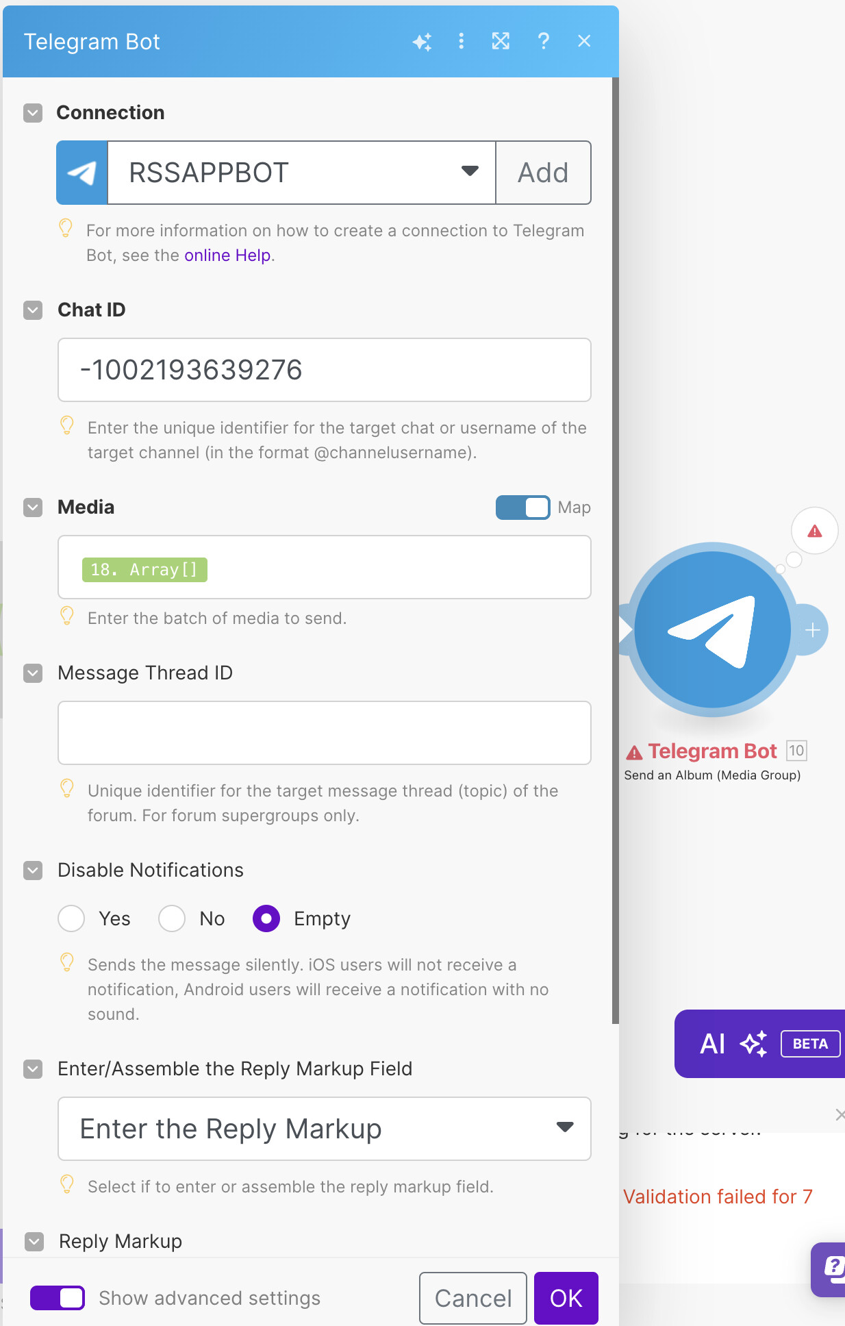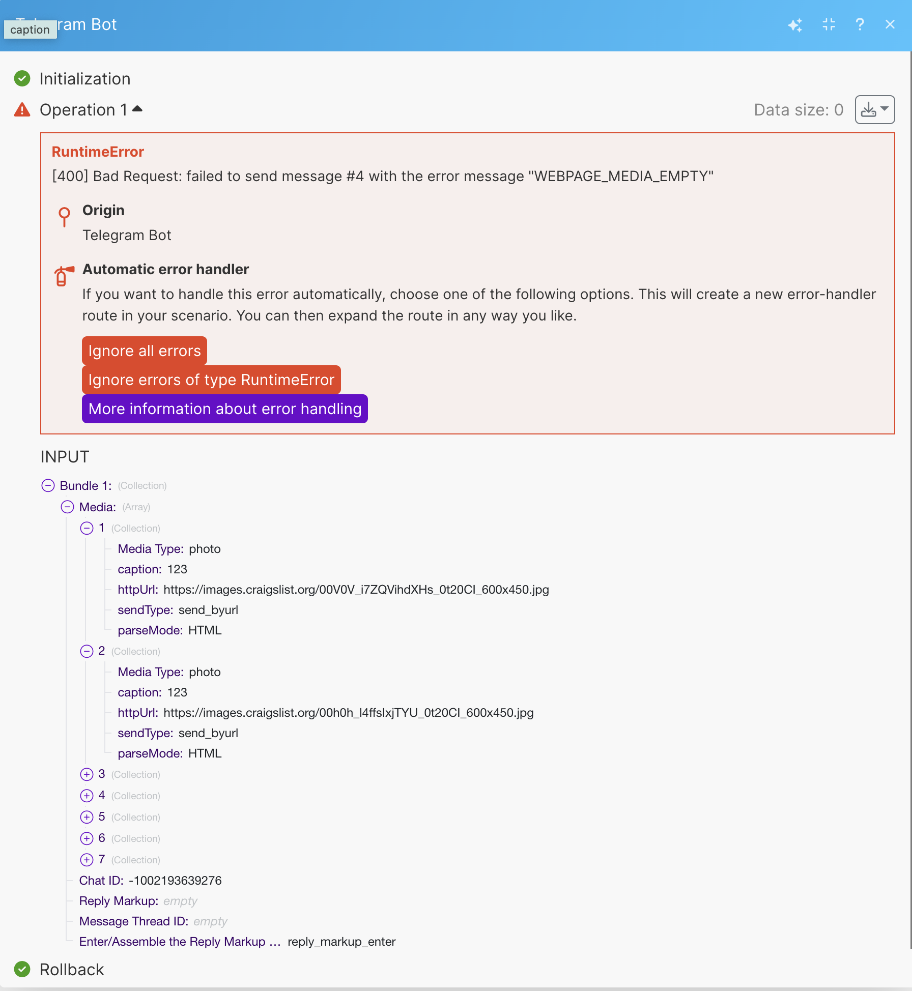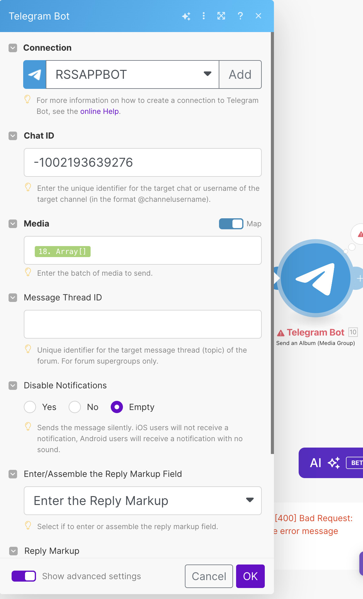 Hello I have a problem, I haven’t been able to solve this simple problem for three days now, I’ve tried all sorts of methods, telegram gives me one or two errors. I want to upload an album from an array of photos to Telegram