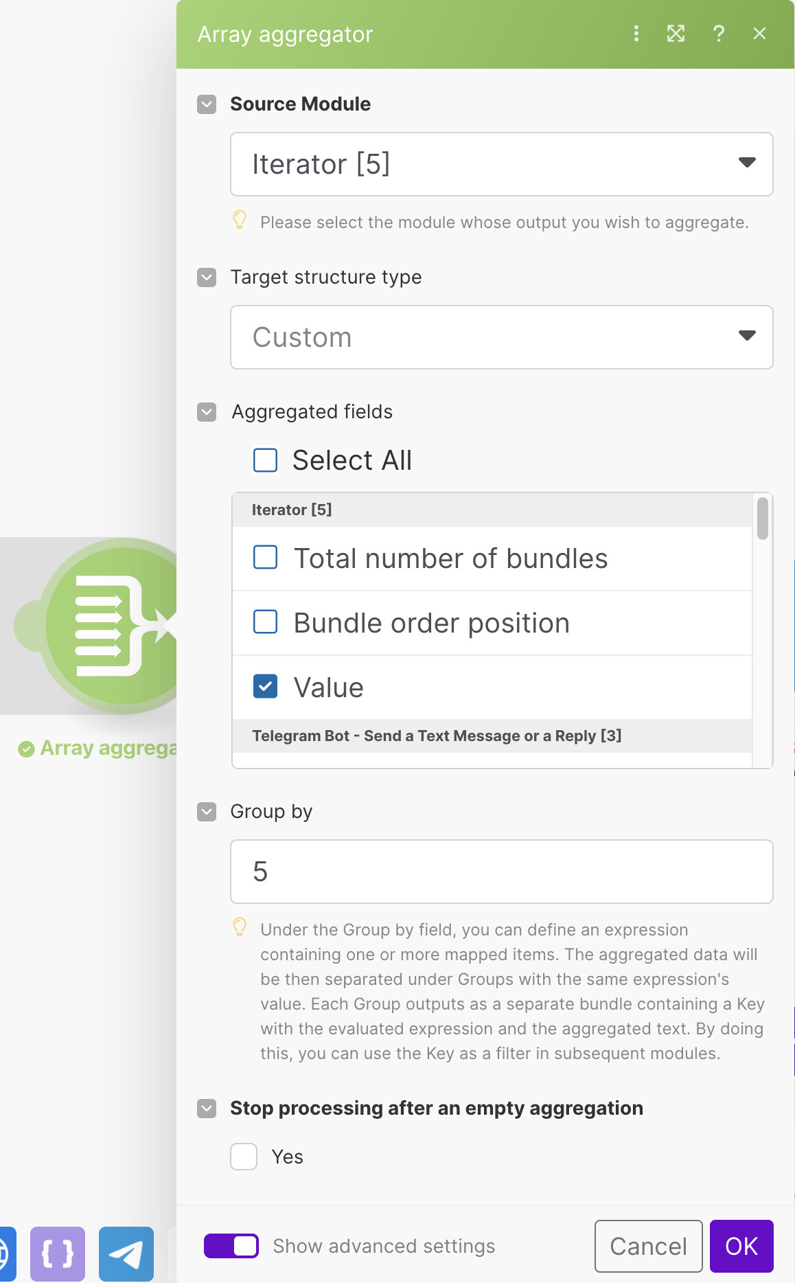 Aggregators are modules that accumulate multiple bundles into one single bundle. An example of a commonly-used aggregator module is the Array aggregator module. The next popular aggregator is the Text Aggregator which is very flexible and can apply to many use-cases like building of JSON, CSV, HTML.