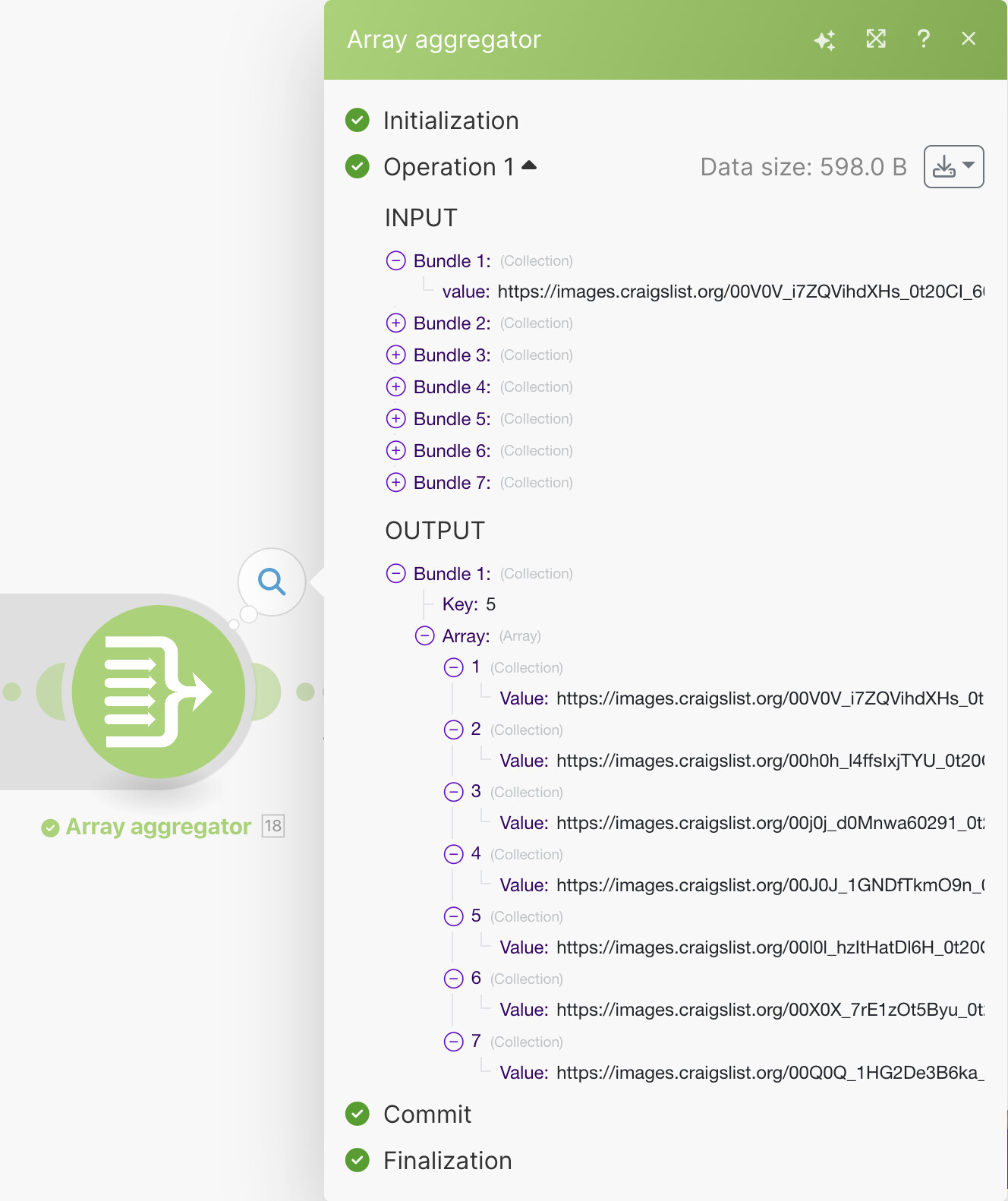 Every result (item/record) from a list/search/match module will output a bundle. This can result in multiple bundles, which then trigger multiple operations in future modules (one operation per bundle). To “combine” multiple bundles into a single variable, you’ll need to use an aggregator of some sort.