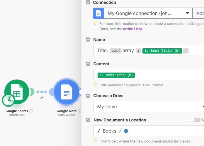 I’ve searched around and cannot find any info on this. It may not be a function yet. I want to use the google sheet watch function to create a new google doc and then save it to Google Drive. The idea is that I’ll add a new row (column a and column b) Then Make will trigger the creation of a google doc and using the info in column A, name the new doc and then save it to the Google Drive.