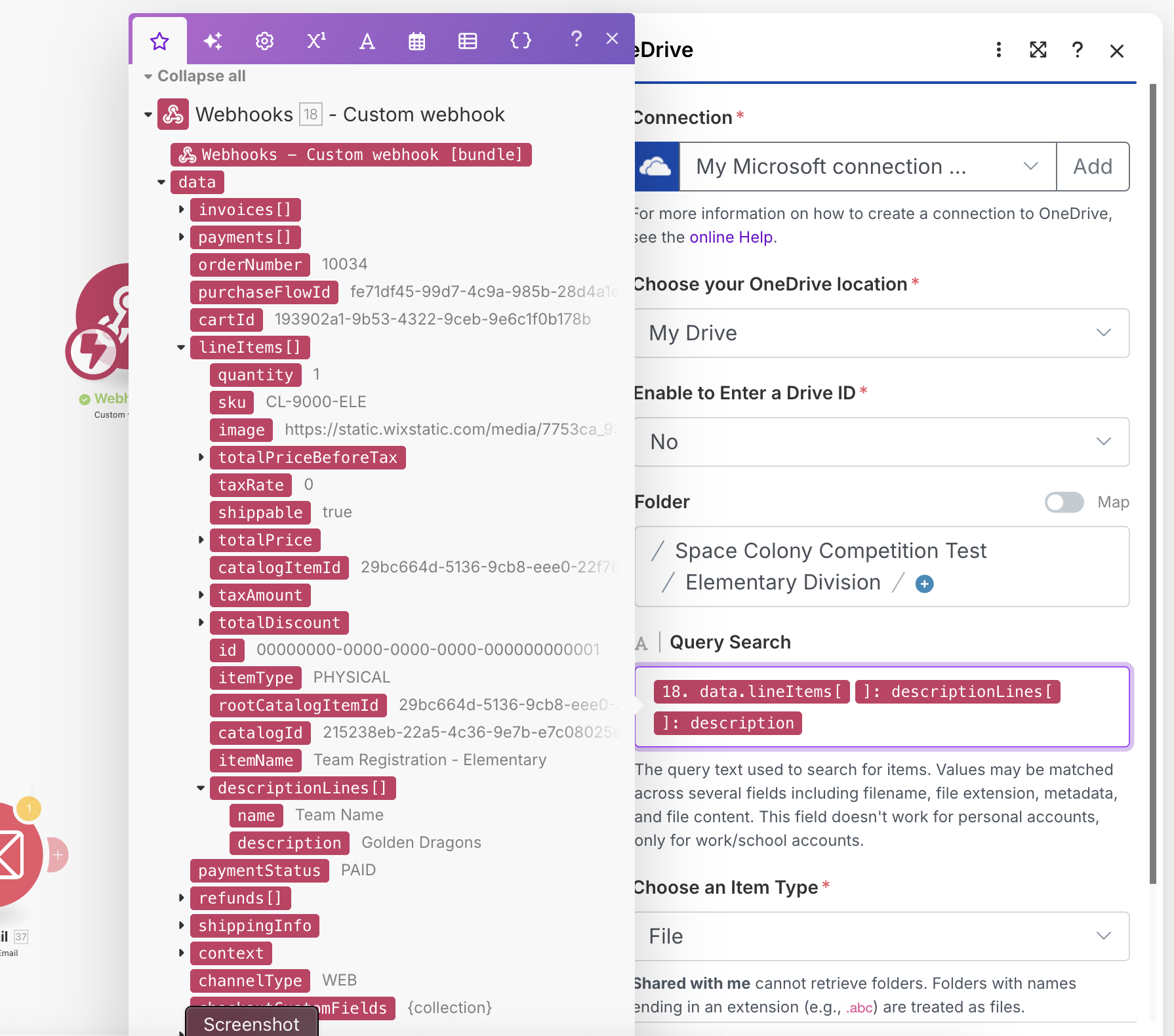 At this point, I just need a reliable way to access all three descriptionLines values (Division, School, Team) in later nodes so I can use them in my OneDrive folder search and creation logic.