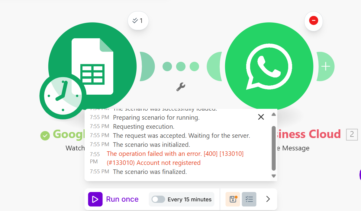 I am getting below error while sending whatsapp template message. I creatd new whatsapp business account trhough make.com itself still I am getting error.