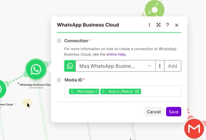 If the incoming message is an audio note, it is downloaded using the WhatsApp media download step.