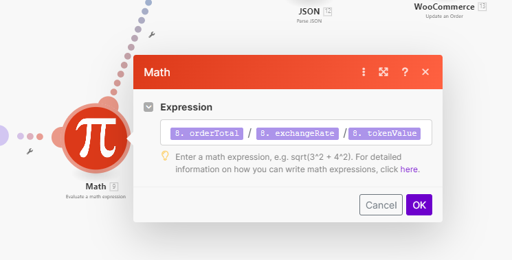 I need to make a calculation so that the result is the value in cryptocurrencies to be sent. My mother currency is the Brazilian real, people will buy in reais, so they need to make a calculation, the value of the purchase divided by the dollar rate (I’m going to enter it manually, I’m not going to add any API to pull it automatically, first I have to do function). This would be the first part of the calculation, something like this, for example: